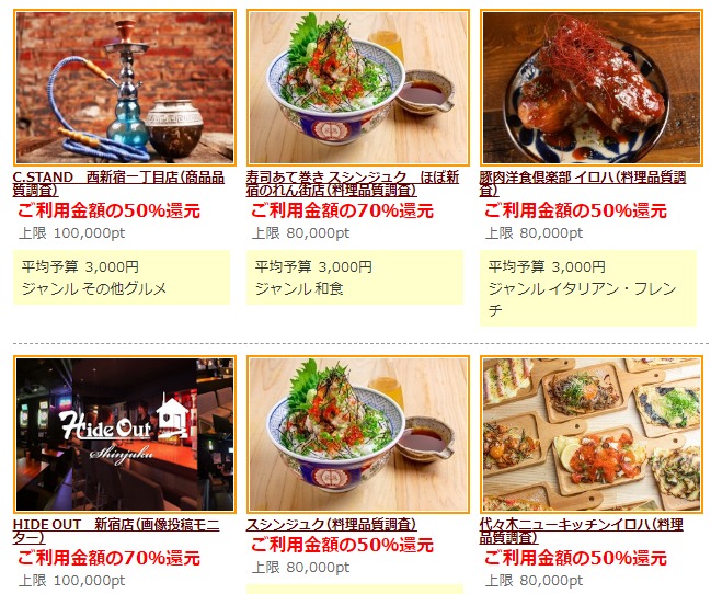 食事(外食)モニターとは、決められたお店で飲食をし、指定の写真を数枚撮ったり、アンケートに回答するだけで食事代金の30%~50%程度の報酬をもらえる案件です。